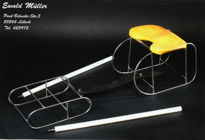 - bestehend aus Sitz und Fußteil - Antrieb mittels mit Stahlspitzen versehenen Stöcken - Steuerung mit einem verstellbaren Verbindungsgurt - Sitzschale aus Holz oder Kunststoff - Konstruktion aus Nirosta-Stahl